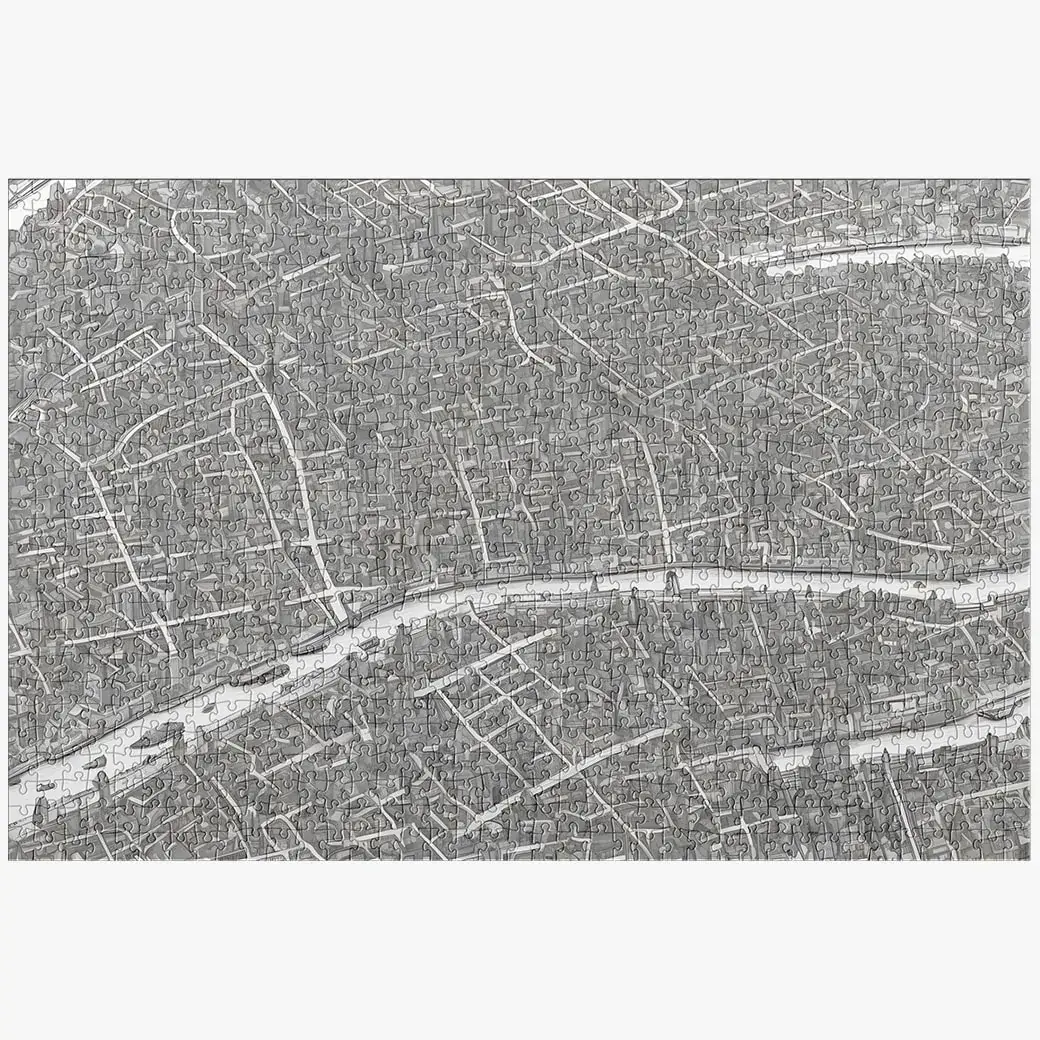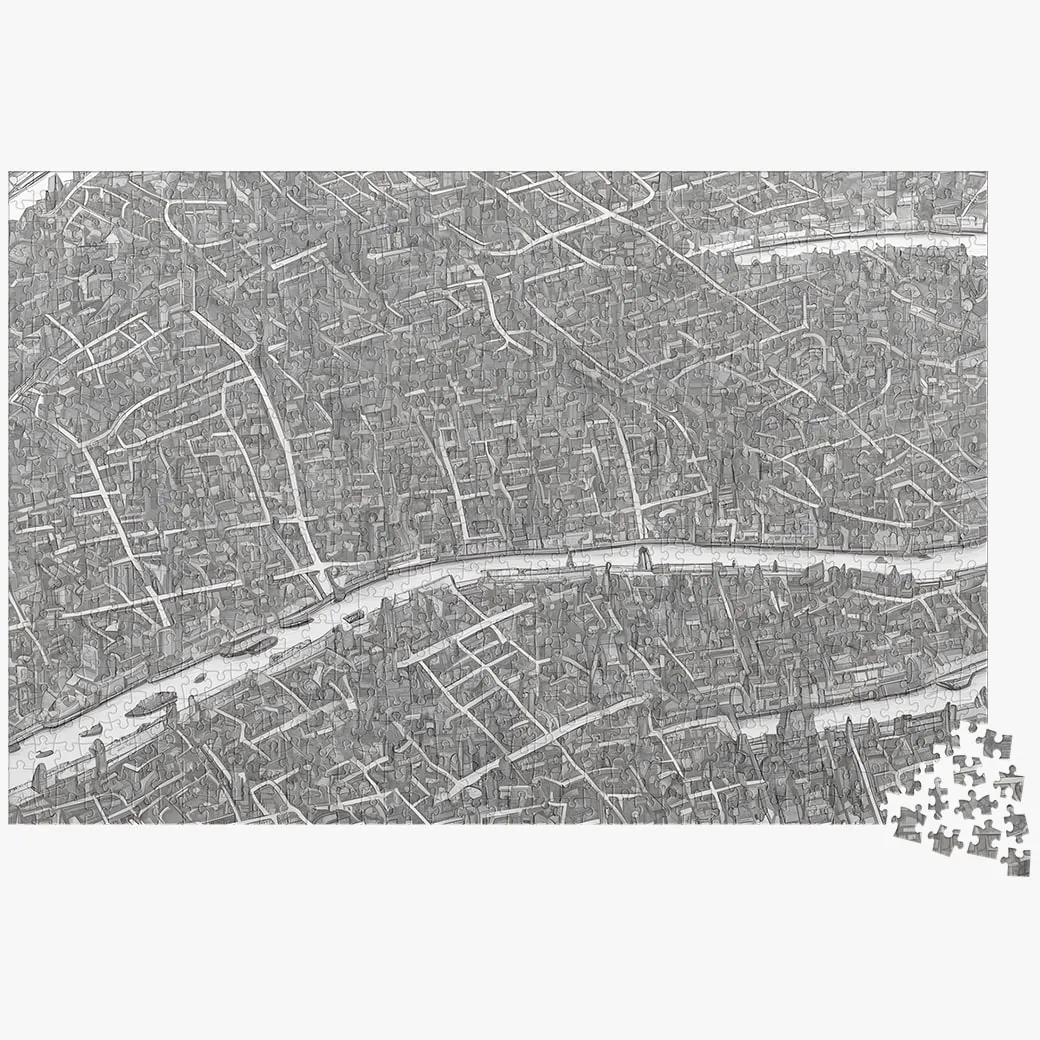 Embark on an Urban Adventure: Dive into the mysterious streets of a fictional city with our black-and-white map jigsaw puzzle. This 1000-piece challenge invites you to explore a meticulously detailed, imaginary urban landscape. Each piece guides you through the intricate avenues, boulevards, and hidden corners of a city that exists only in this puzzle and your imagination.