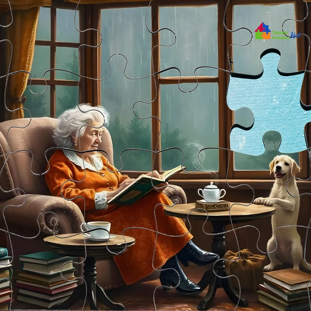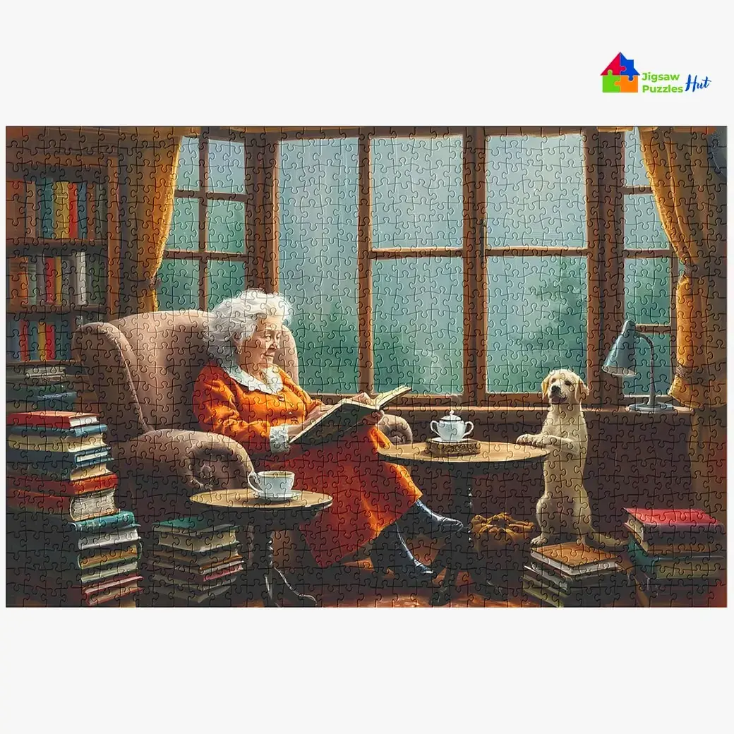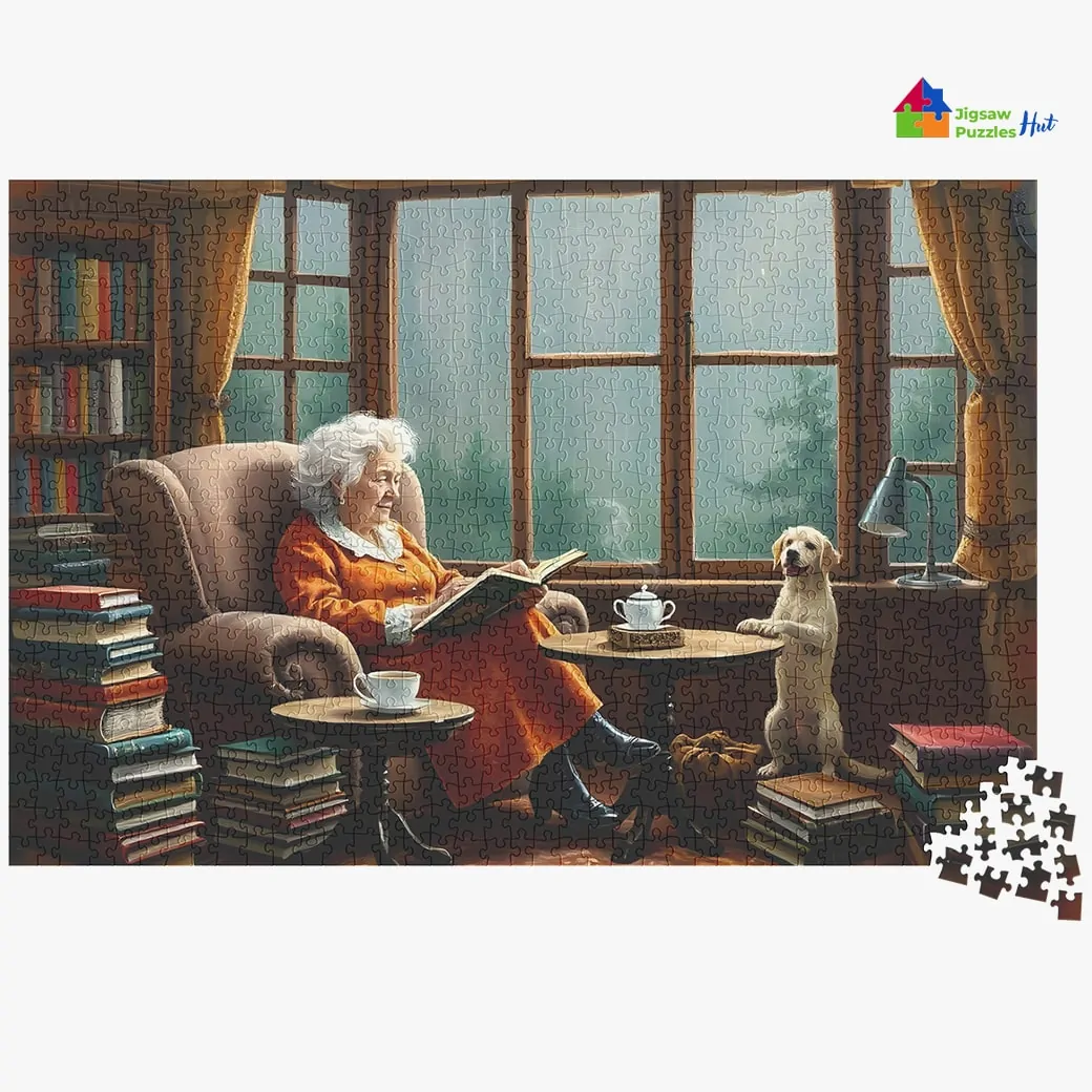 Immerse yourself in the cozy charm of a peaceful afternoon with the Book Nook Jigsaw Puzzle. This 1000 piece puzzle captures a heartwarming scene of Grandma reading a book in the corner, while outside, the rain softly falls. Inside, a playful dog adds a touch of joy to the serene atmosphere. Perfect for puzzle lovers, this daily life puzzle brings a sense of comfort and warmth to your puzzling experience.
