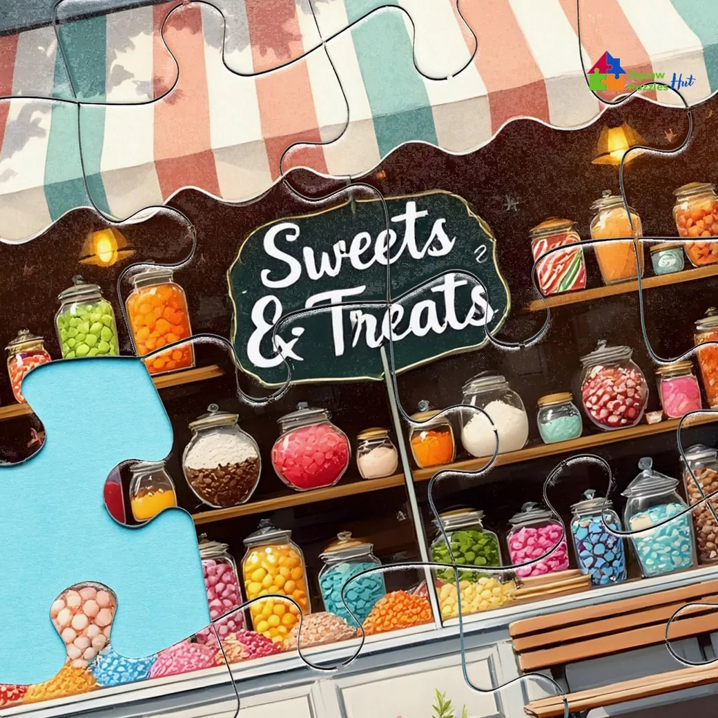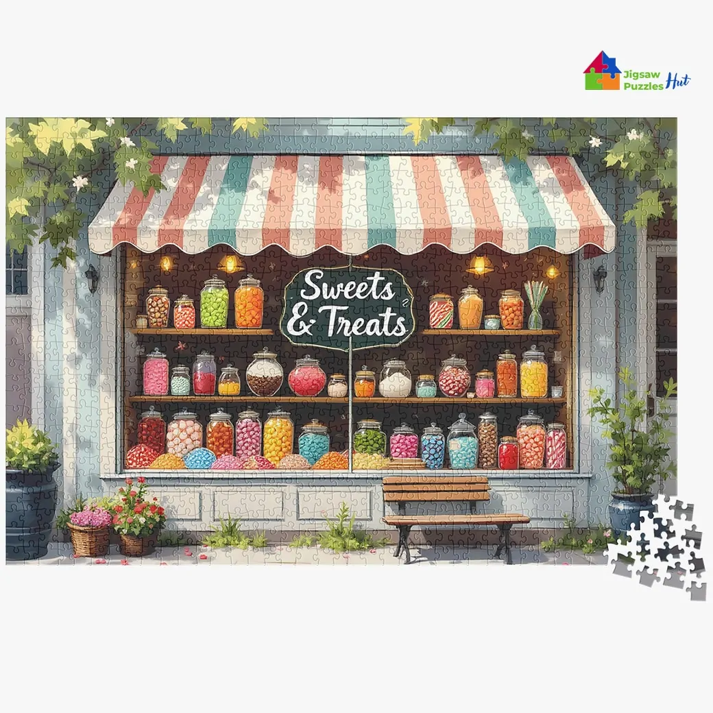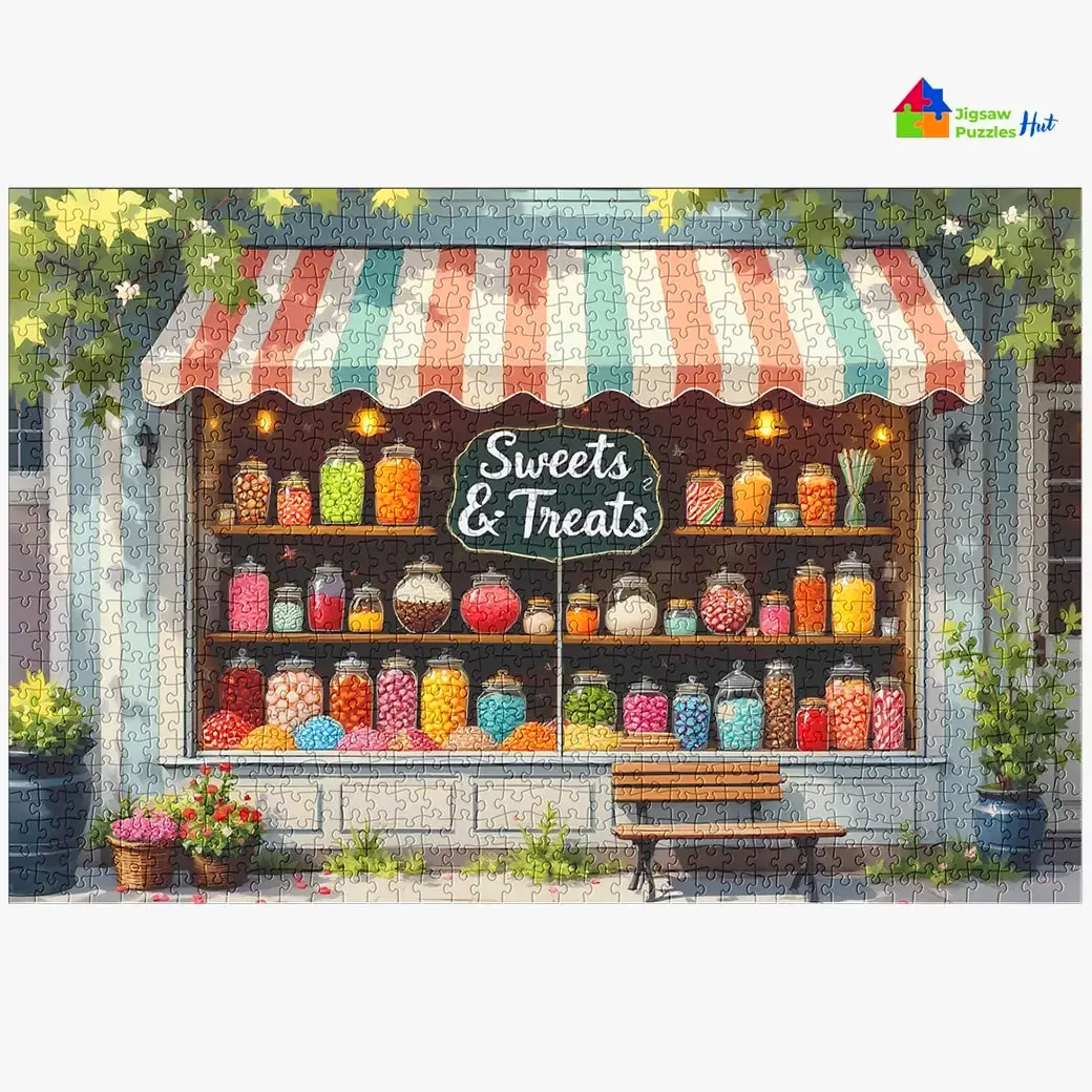 Indulge in the delightful nostalgia of a Classic Sweets Shop Jigsaw Puzzle. This 1000 piece puzzle for adults captures the front view of a charming sweets and treats shop, brimming with vintage details that evoke the cozy essence of daily life. Perfect for anyone who enjoys puzzles that tell a story and bring warmth to their collection.