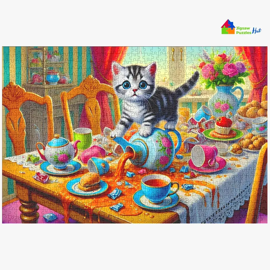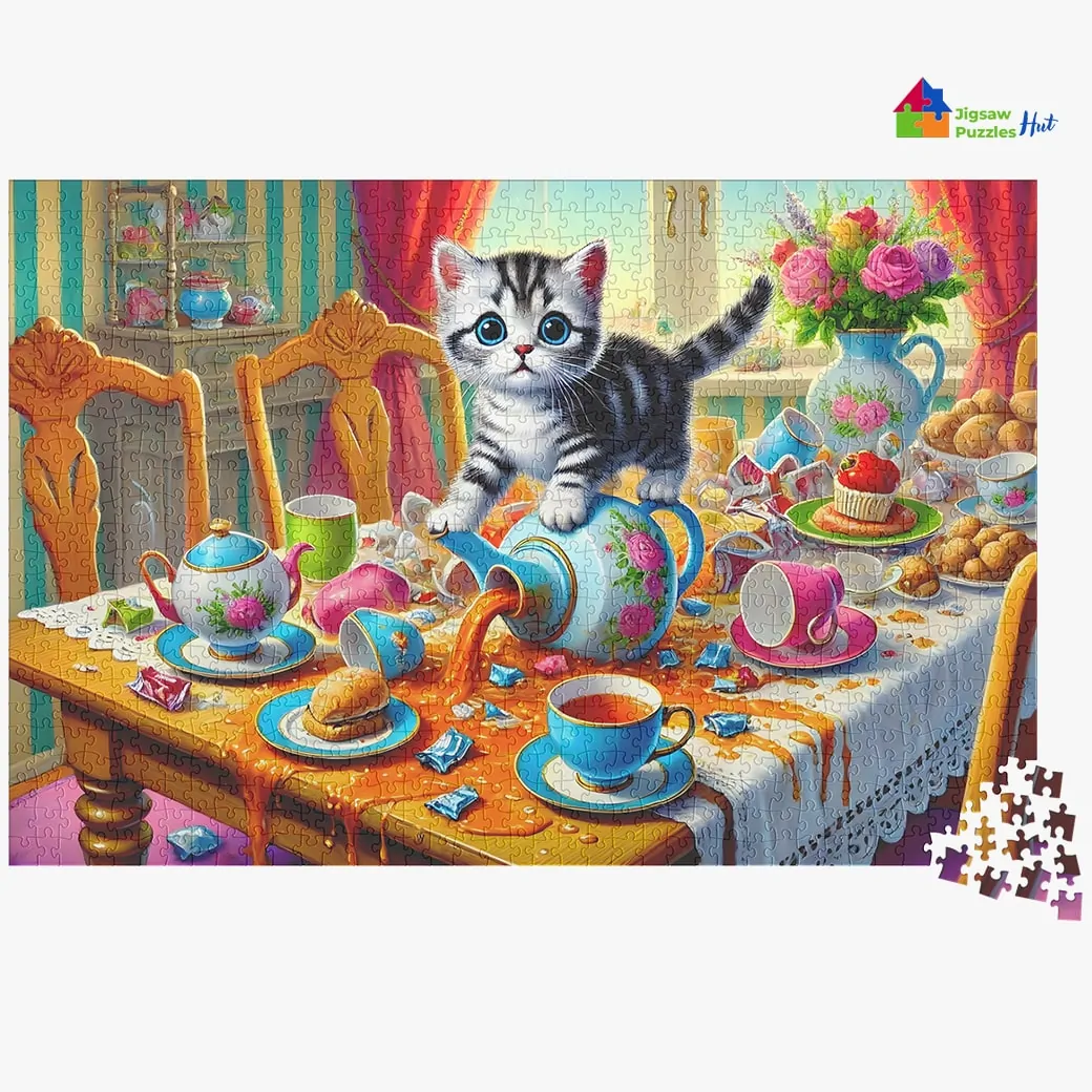 Delight in the playful antics of a mischievous feline with the Cute Kitten Making Mess Jigsaw Puzzle. This 1000 piece jigsaw puzzle for adults features an adorable scene of a curious kitten causing chaos on the dining table—spilling coffee and leaping over plates of food. Perfect for those who cherish heartwarming and humorous moments.
