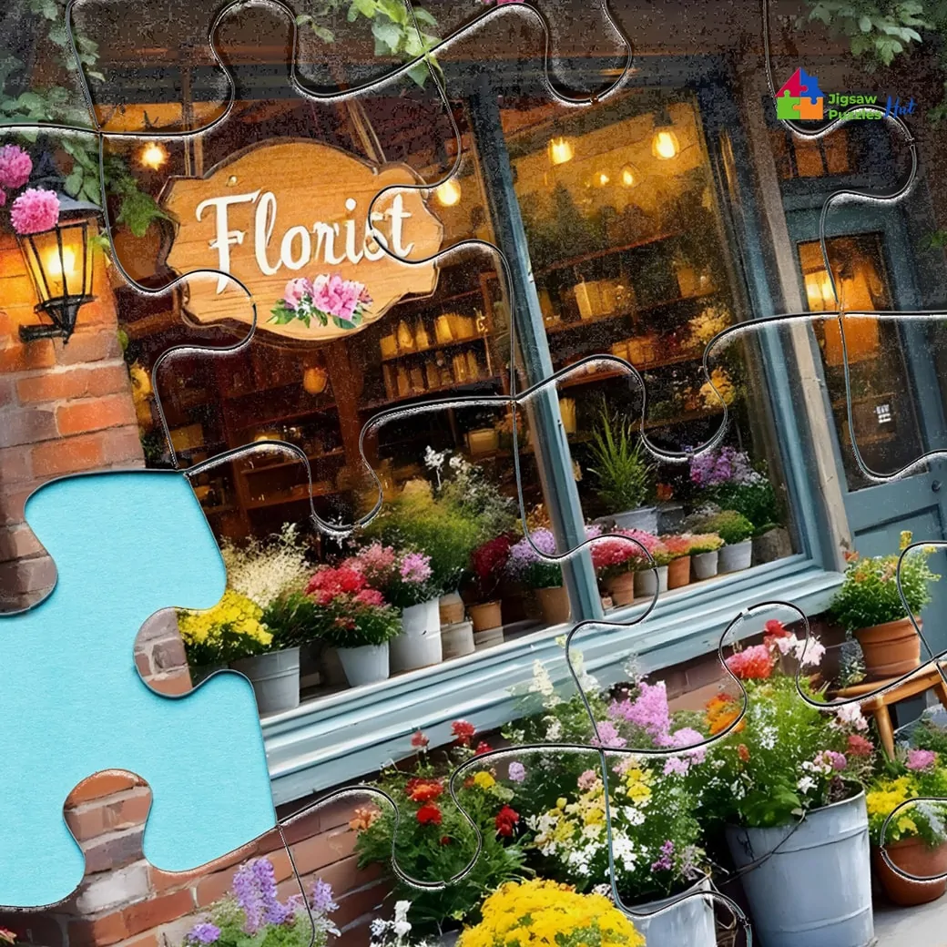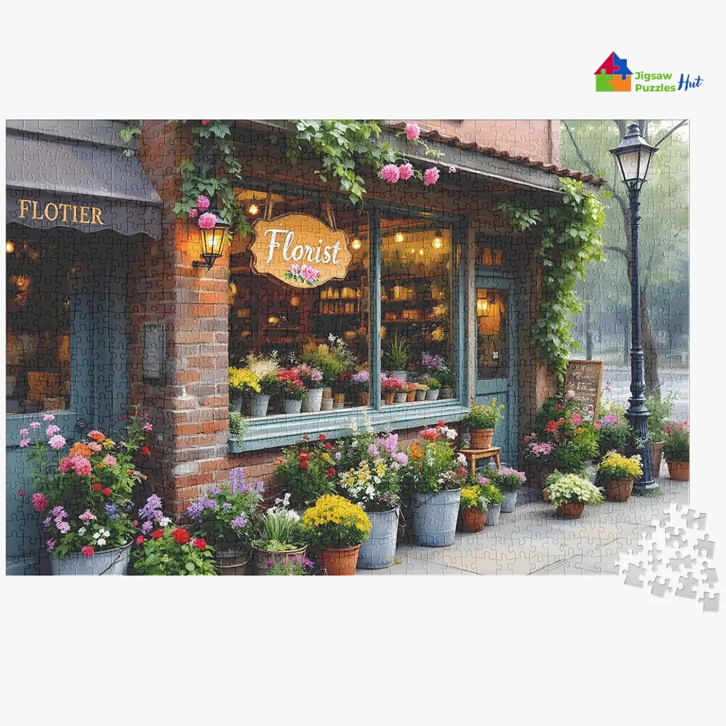 Immerse yourself in the picturesque charm of a bustling street corner with the Flower Shop Jigsaw Puzzle. This 1000 piece puzzle for adults captures the beauty and tranquility of daily life, featuring a stunning front view of a vibrant flower shop adorned with colorful blooms and rustic details.