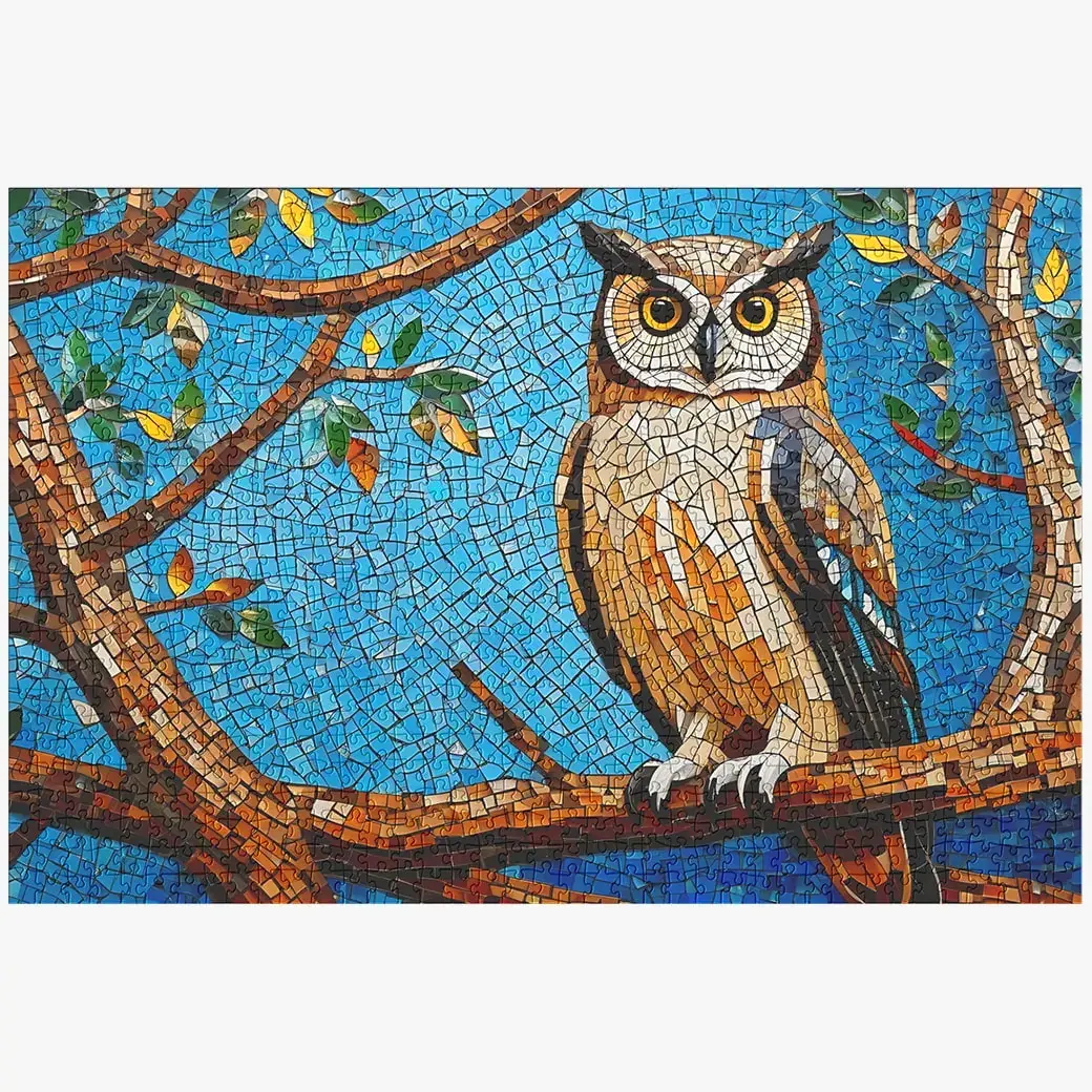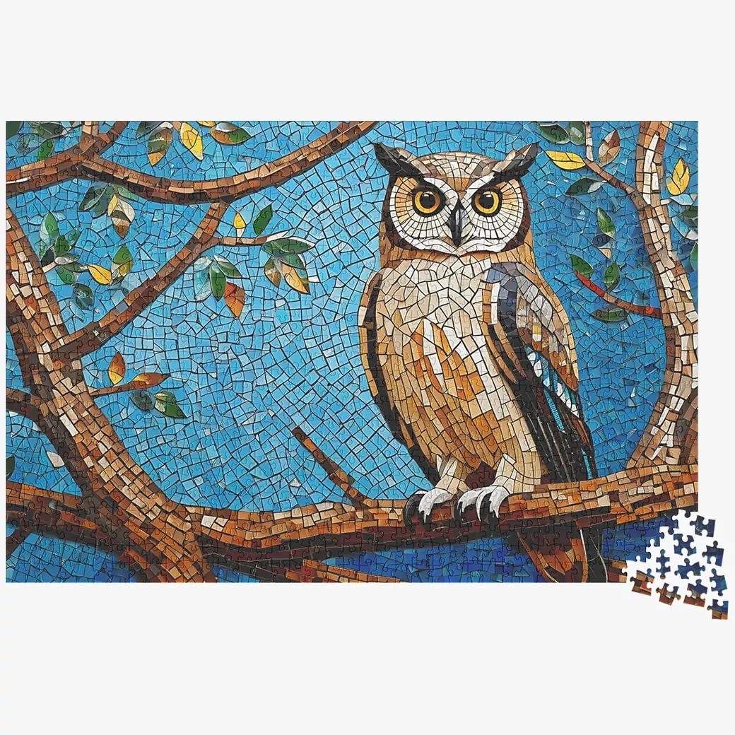 Crafted with precision and attention to detail, each puzzle piece features a mosaic design that adds a touch of sophistication to the whimsical scene. The vibrant colors and intricate patterns of the owl and the tree create a visually stunning image that will captivate both puzzle enthusiasts and lovers of fine art.