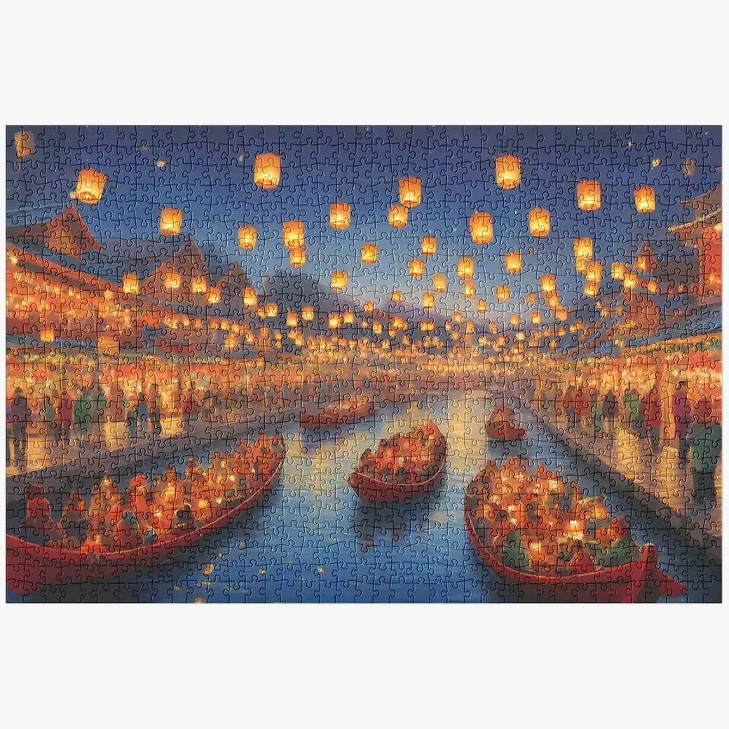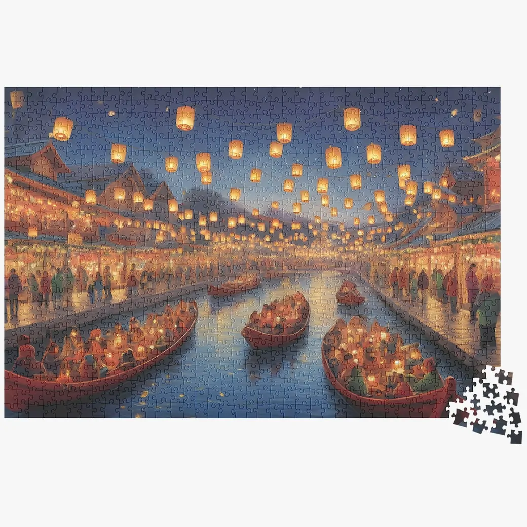 Embark on a Luminous Adventure β Immerse yourself in the warm glow of the Rivertown Light Festival with our 1000-piece jigsaw puzzle. Capturing the magical moment when lanterns light up the night, boats gently float on the river, and the market comes alive with colors, this puzzle brings the charm and excitement of a festive night directly to your home.