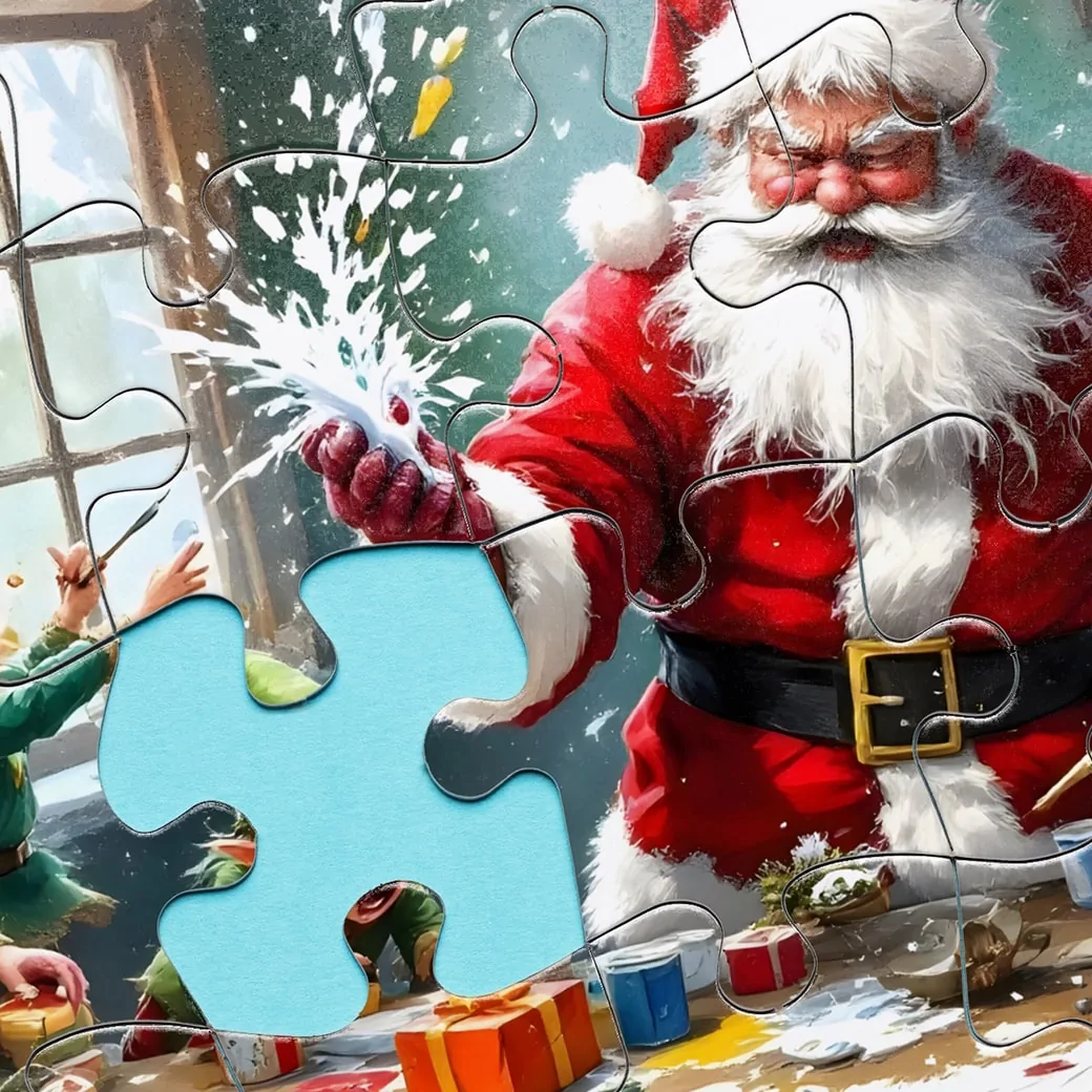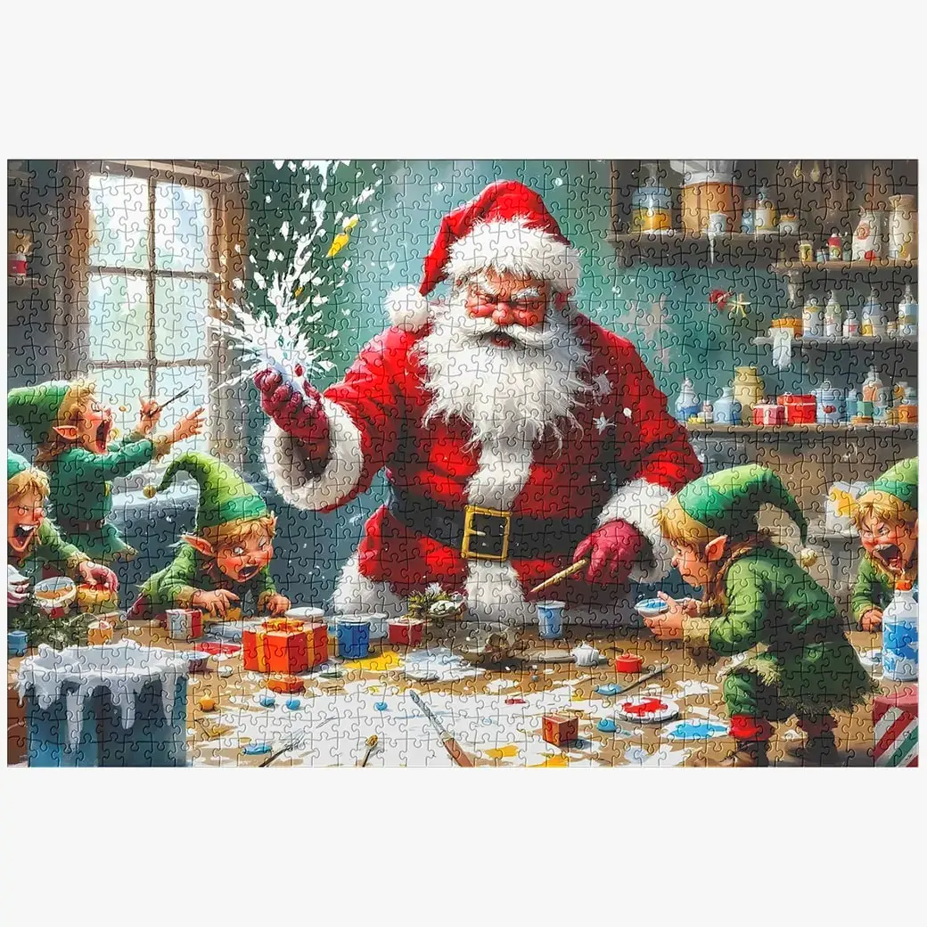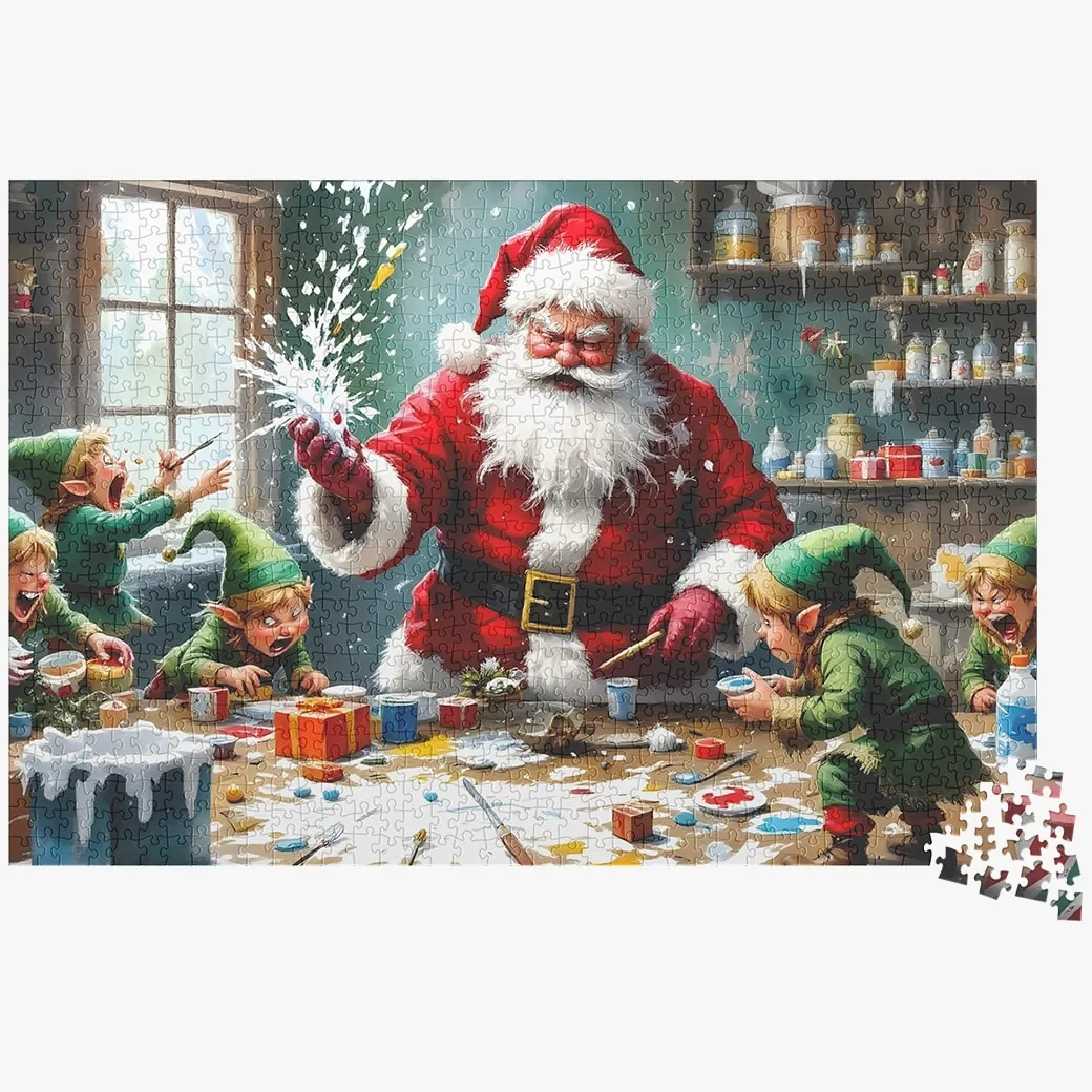 Add some holiday fun and laughter to your puzzle collection with the Santa and Elves Jigsaw Puzzle – 1000 Piece Christmas Puzzle For Adults. This whimsical puzzle captures a lively scene inside Santa’s workshop, where mischievous elves are playfully irritating Santa and making a cheerful mess. From spilling paint on the table to causing all sorts of Christmas chaos, the elves bring humor to this beautifully illustrated Christmas jigsaw puzzle. Perfect for the holiday season, this puzzle is sure to bring smiles and festive cheer to your home.