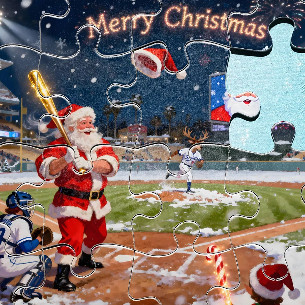 Slide into the holiday spirit with Santa Playing Baseball, a lively 1000 Piece Christmas Jigsaw Puzzle for Adults that blends festive fun with America’s favorite pastime! This unique puzzle showcases an action-packed scene at Dodgers Stadium, where Santa Claus is hitting a powerful home run in a thrilling North Pole vs. Dodgers holiday showdown.