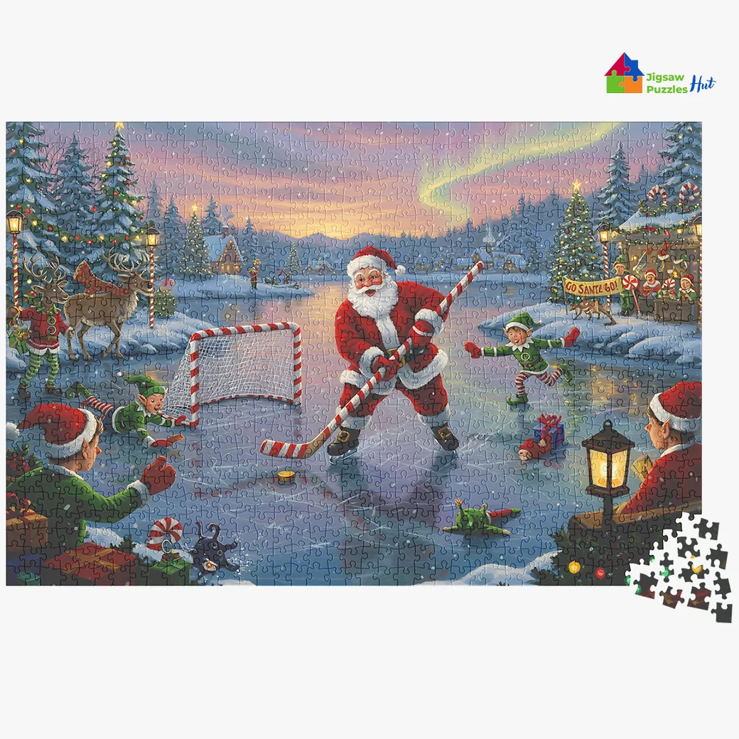 Slide into festive fun with the Santa Playing Ice Hockey 1000 Piece Christmas Jigsaw Puzzle for Adults! This unique puzzle captures an energetic and joyful winter scene where Santa is on the ice, fully geared up and mid-action in a spirited hockey match. On the sidelines, cheerful elves wave signs and reindeer stomp their hooves in excitement, cheering Santa on as he skates across a frozen pond beneath twinkling Christmas lights.