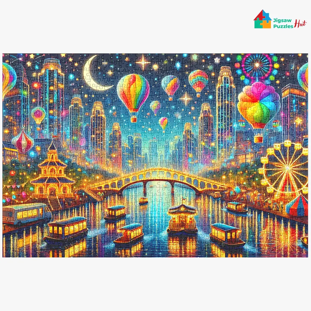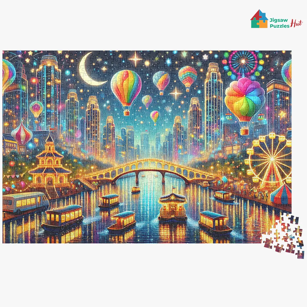 Dive into a world of vibrant lights and festive atmosphere with “The Carnival On River” 1000 Piece Jigsaw Puzzle. This enchanting puzzle brings to life a mesmerizing night scene where the river glows with the reflections of countless lights, and the sky is filled with radiant hot air balloons soaring above, spreading their shine across the night.
