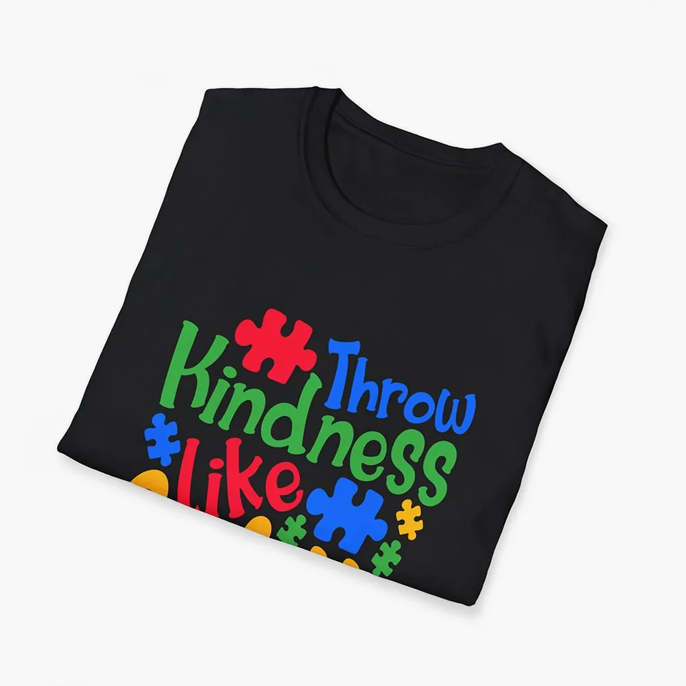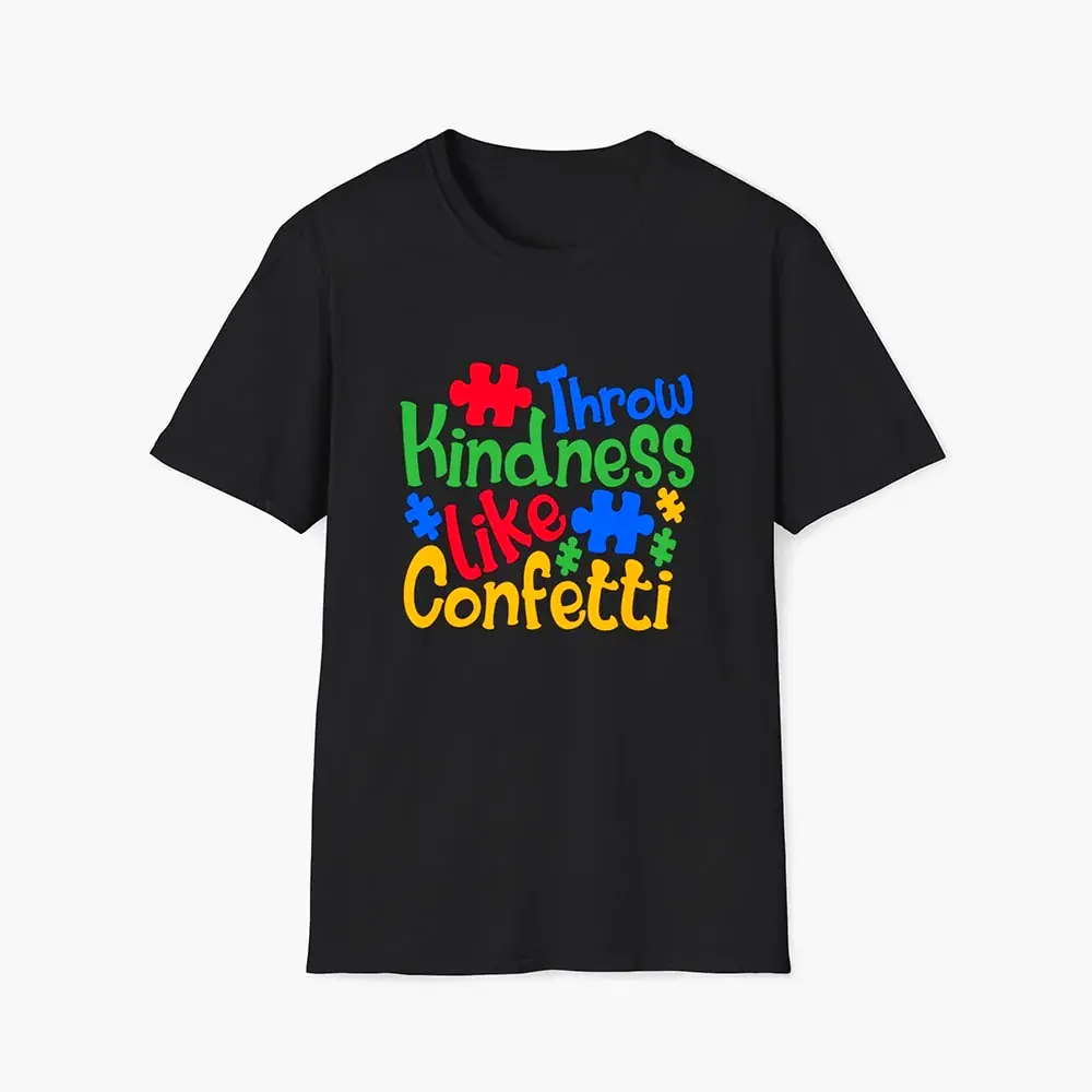 Meaningful Design: The T-shirt features a vibrant graphic with the uplifting message “Throw Kindness Like Confetti” alongside a puzzle piece, symbolizing autism awareness. The design promotes kindness, acceptance, and understanding.