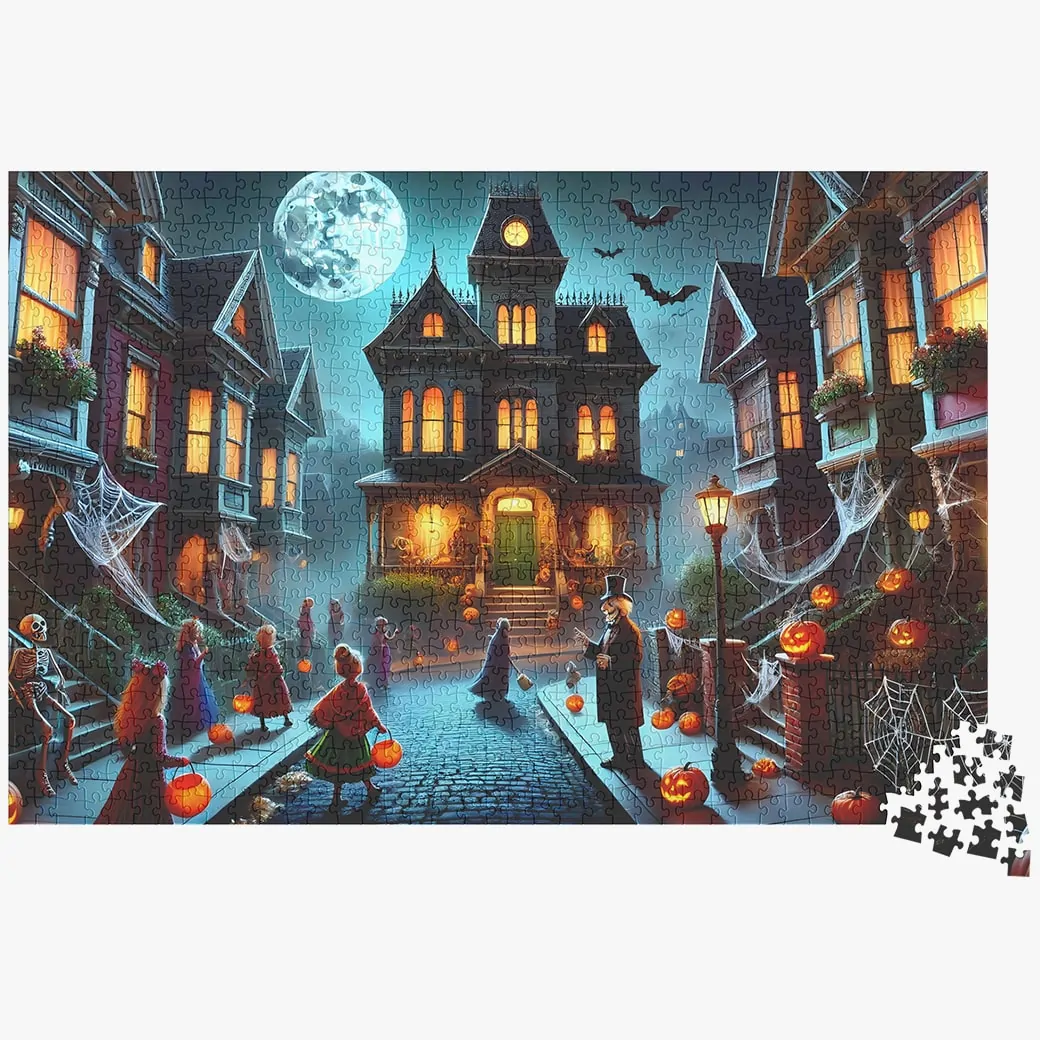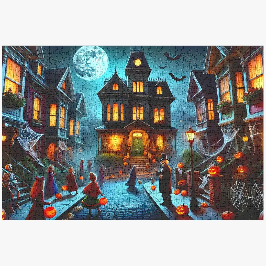 Bring the magic of Halloween night into your home with the Trick or Treat Street Halloween Jigsaw Puzzle – where the spooky meets the spectacular!