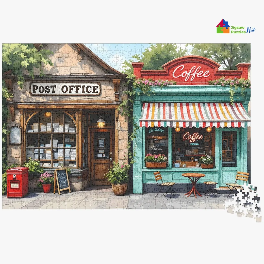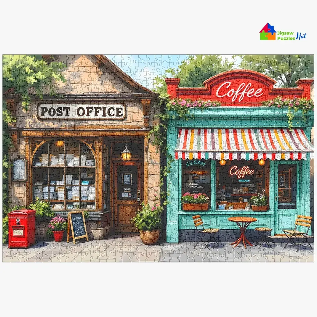 Step back in time and enjoy the charm of daily life with the Vintage Post Office Beside Coffee Shop Jigsaw Puzzle. This 1000 piece puzzle for adults features a beautifully detailed front view of a classic post office nestled beside a cozy coffee shop, capturing the warmth and nostalgia of a bygone era.