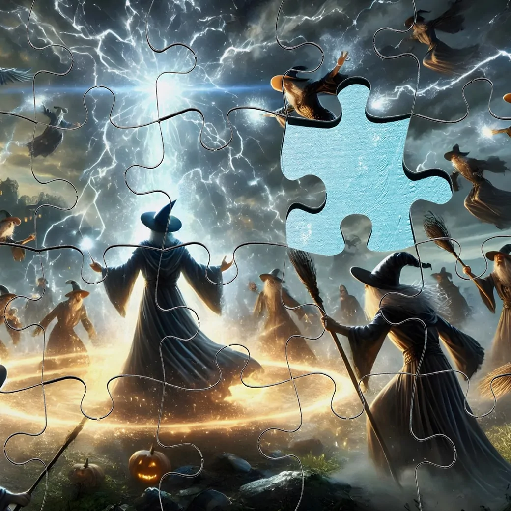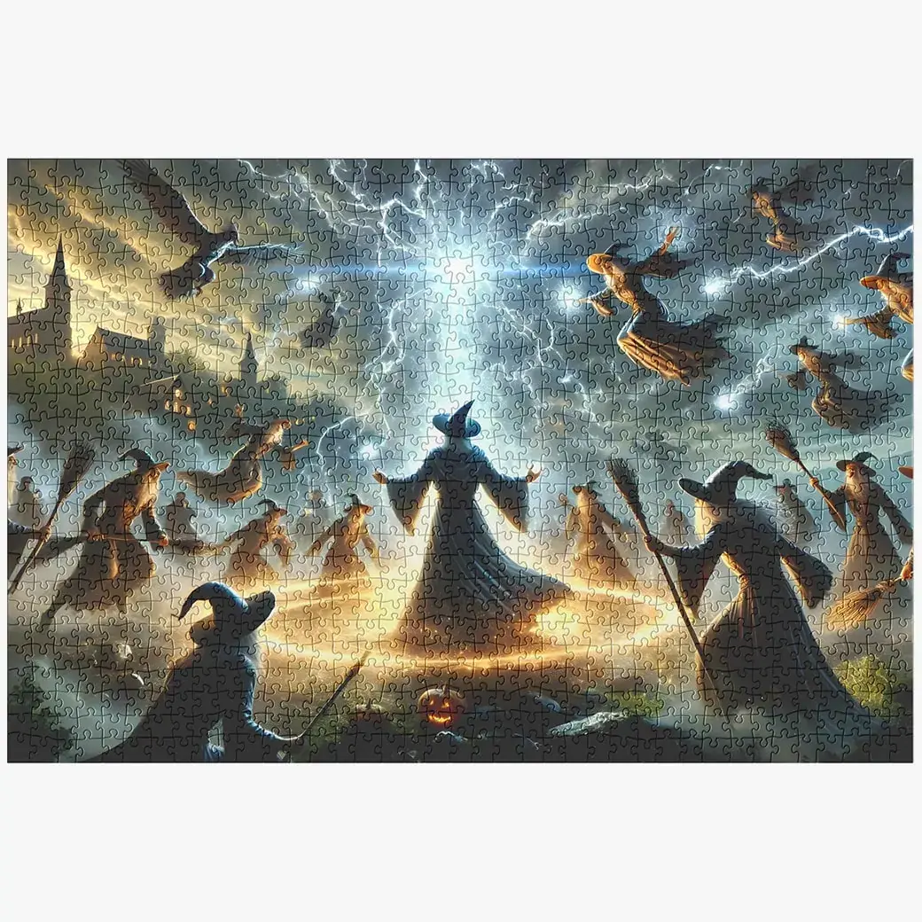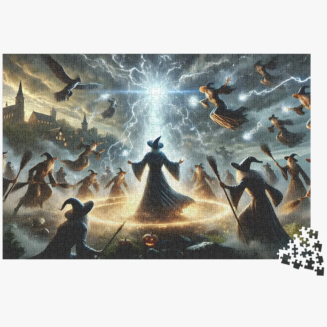 Enter a world of magic and mystery with the Wizard vs The Witches Jigsaw Puzzle – 1000 Piece Puzzle For Adults, a captivating Halloween puzzle that brings an epic battle to life. In this thrilling scene, a powerful wizard faces off against a group of cunning witches, each wielding their magical powers. Sparks fly as spells clash, creating an intense and detailed puzzle experience perfect for fans of Halloween and fantasy.